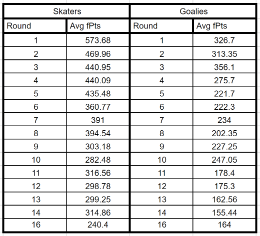 Here is the Average fPts per round of all skaters and goalies: