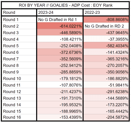 Consider the sheer number of skaters in each bucket and how many players performed comparably. I find the >150 ADP row particularly useful, as it matches the range where a GM who avoided early goalies would likely draft a goalie.