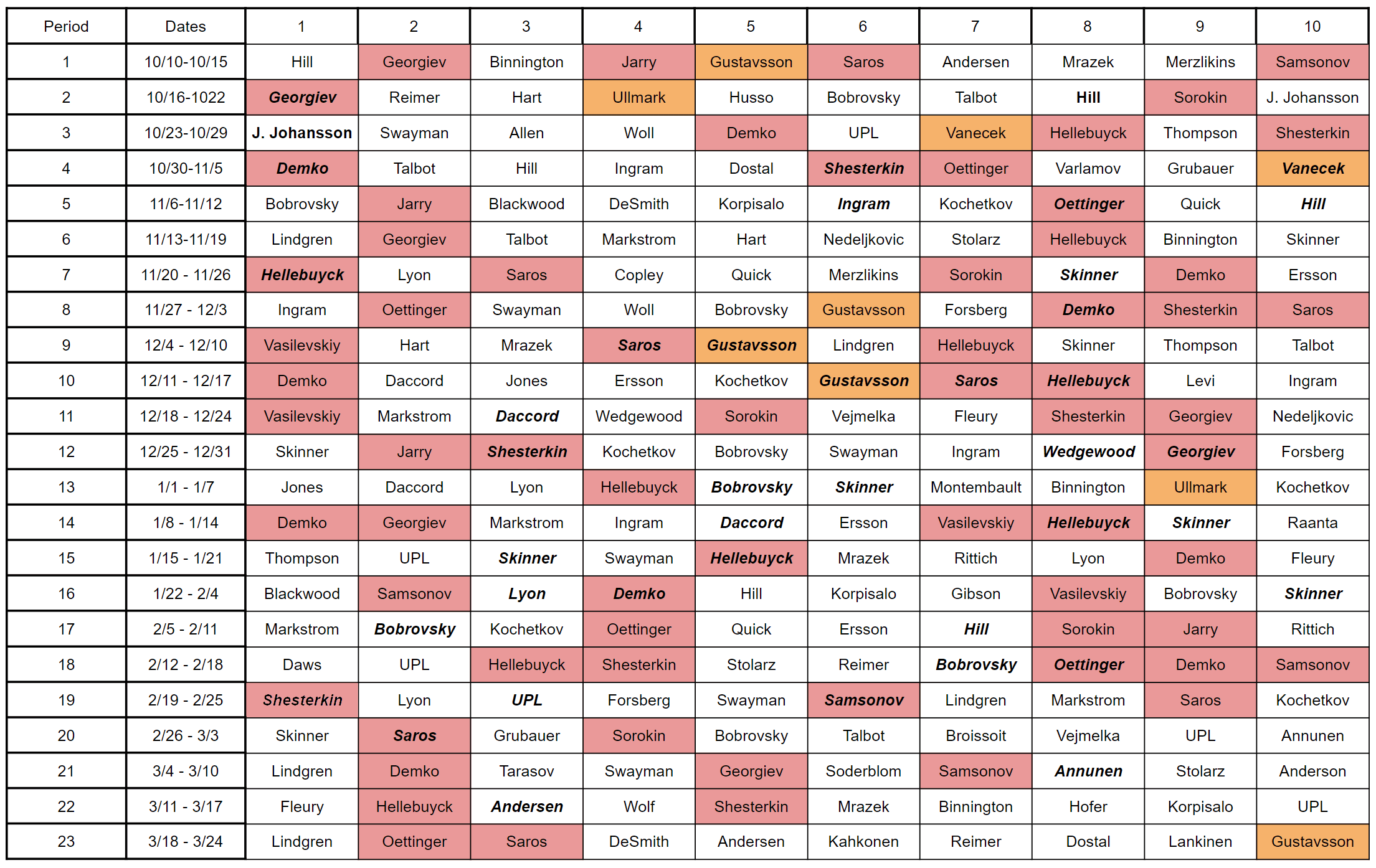 I highlighted goalies with KKUPFL ADPs inside the top 10 in red and those ranked G10-G14 in orange. Bold, italicized names indicate back-to-back top-10 performances, showing the stretches of relevance for each of these top-10 goalies.