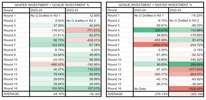 - Skaters Provide Better Returns: Across the board, whether via Draft or Free Agency, skaters offer a higher Return on Investment (ROI) compared to goalies. In 2023-24, GMs saw a 75.22% better return on skaters than on goalies.