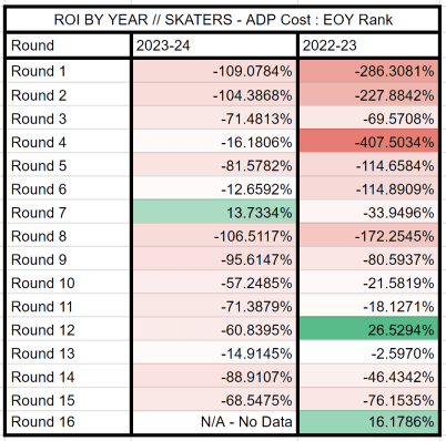 This analysis also does not account for player ownership availability during a given period. Itâs based on the similar assumption that you could always grab a player like Stuart Skinner or be the only GM in the market for a top-10 goalie. Similarly, it assumes that skaters in the specified ADP buckets were 100% available.