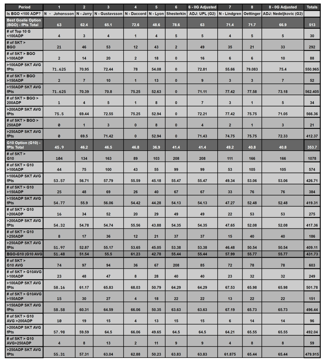 Twice, there were no skaters with an ADP over 250 who outperformed the Best Goalie Option (BGO)âJonas Johansson in Week 1 and Joey Daccord in Week 4. Other than these instances, there wasnât a single week where a goalie stream outperformed a skater stream. I wonder if this might change after matching up the date ranges.