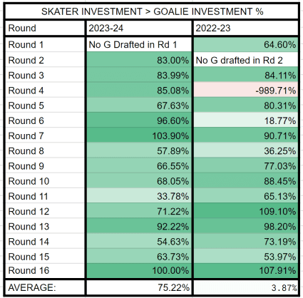 - 3. Skater-Goalie Comparison: High draft capital skaters fail just as often as goalies. In 2023-24, for every Andrei Vasilevskiy, there was a Jack Hughes. For every Alexandar Georgiev, a Tim Stutzle. Drafting a volume goalie in the mid-late rounds and keeping them offers more stability than constantly cycling through goalies.
